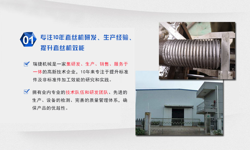 河北省邢台市瑞捷机械设备公司,创建于2003年,坐落在全国的机械制之乡-邢家湾工业区。本厂专业制造套丝机,TS80型套丝机,TS64型套丝机,TS50型套丝机,螺栓套丝机,S8139型套丝机,S8148型套丝机圆钢/圆管套丝机及切线板牙头等配套产品。